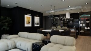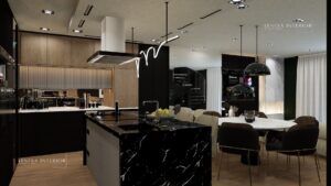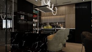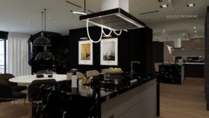 Stepping into the kitchen, you are greeted by a kitchen island that includes an integrated stone prep sink, an induction and a gas stove (both stoves are from Smeg).