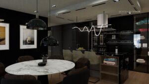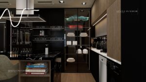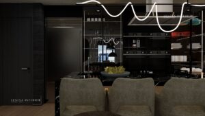 The kitchen features textured wood material, matt wood material, matt grey panels (all from senosa), and glass cabinet doors.