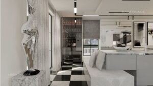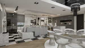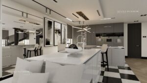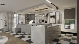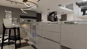This project features a white color scheme, that makes the kitchen space look clean and classic, making it aesthetically pleasing. The kitchen space has smooth, glossy and sleek finishes. Luxury chic at its finest.