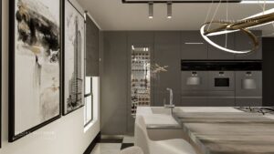 The kitchen features all glossy cabinetry wood finishes (from senosa), and stone finishes (from infinity surfaces).