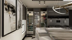 This part of the kitchen island allows the home owners to entertain their guests while cooking, and right next to the cooktops, there’s a prep sink for the cook. And right across the cooktops there are built-in appliances that the cook can easily access, which is the microwave, coffee machine, warmer drawers and an oven. Right next to the appliances, there’s a built-in fridge, built-in wine fridge, and a built-in freezer.