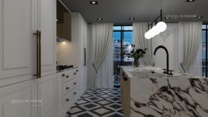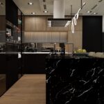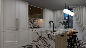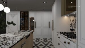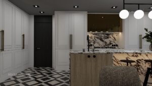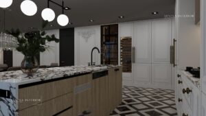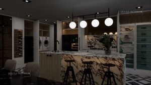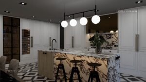 The kitchen features textured wood material (from innovus), glossy cabinet doors, glass cabinet doors and stone finishes (from infinity surfaces).