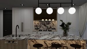Stepping right into the kitchen, you are greeted by the kitchen island, that features an integrated stone double sink, and a built-in dishwasher.